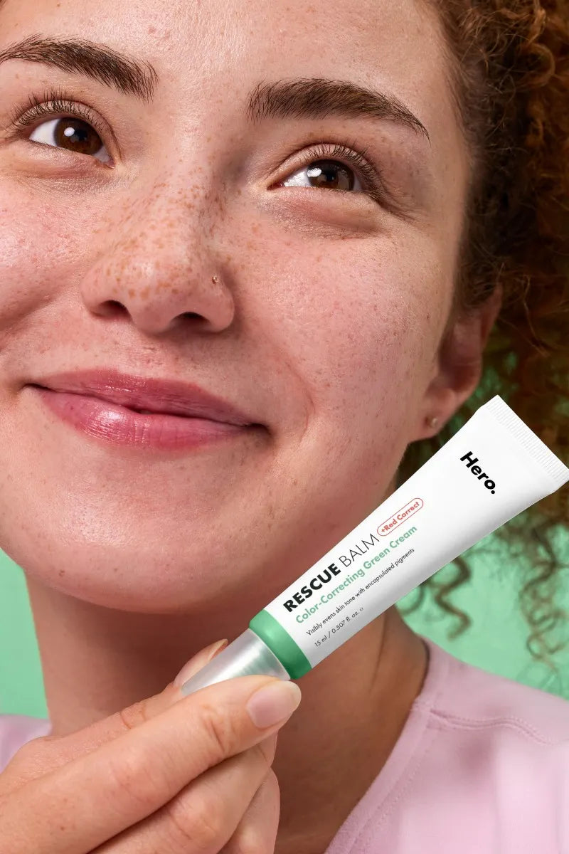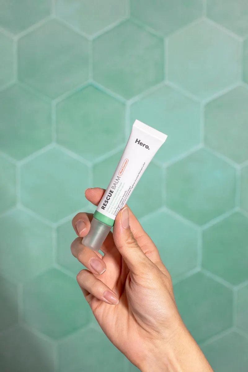 Hero RESCUE BALM + Red Correct is a colour-changing green cream created with encapsulated pigments that activate as you blend, turning from green to beige in seconds, to even post-blemish redness and leave your skin feeling nourished all day.